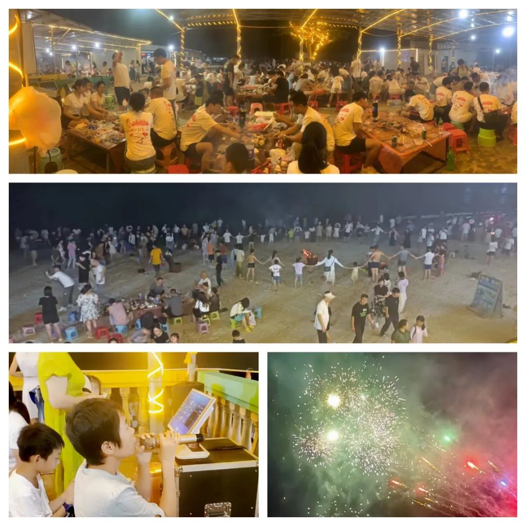 夜幕降临,美食与海边夜景当然不能错过。大家一起在沙滩边上烧烤、喝酒、聊天、行余干酒令(划拳),享受难得的相聚时光。酒足饭饱之后,伴随着沙滩音乐和动听的歌声,举行的篝火晚会和放烟花更是将大家的激情推向高潮。