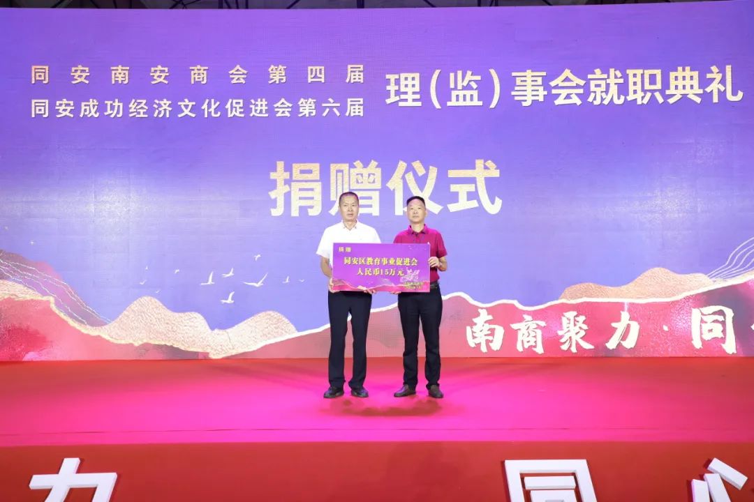 ▲会长刘炳杰代表商会向同安区教育事业促进会捐赠人民币15万元