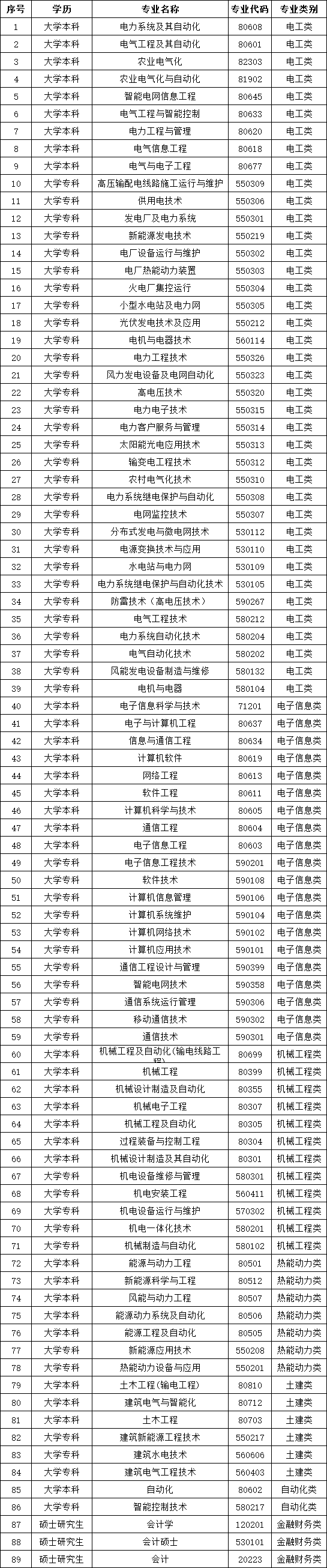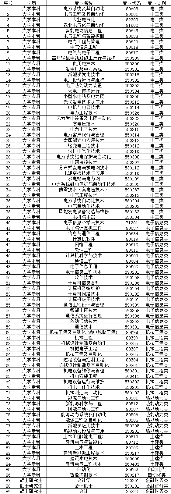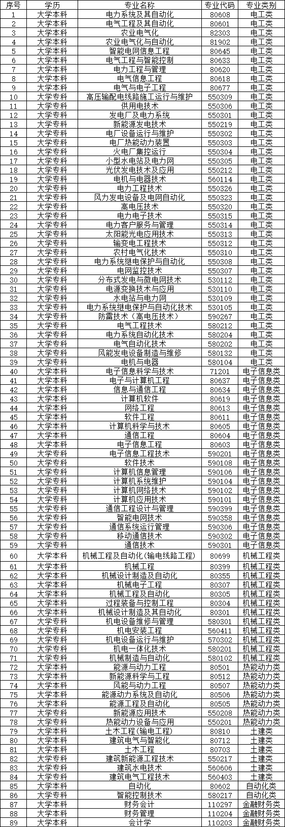 电工类、电子信息类、机械工程类、热能动力类、自动化类、土建类等专业大学专科及以上学历,财务类专业大学本科学历,具有军队服役经历者优先考虑,以上学历和专业以全日制最高学历、主修专业为准,具体如下。