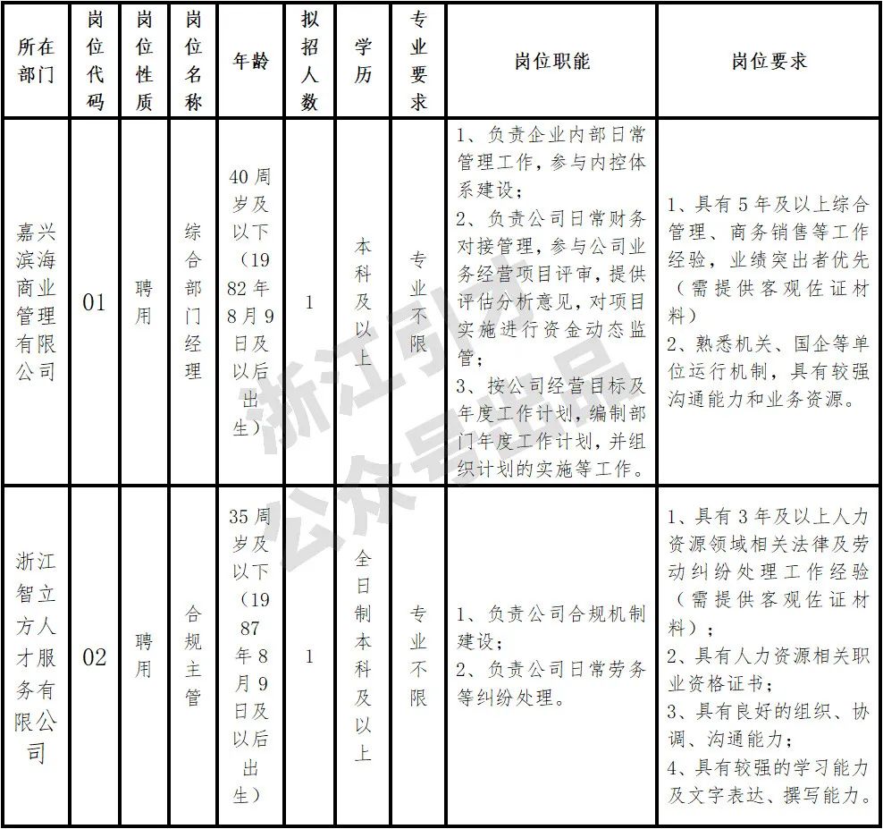 嘉兴滨海商业管理有限公司成立于2021年2月,注册资本为10000万人民币,公司承担着企业管理、供应链管理服务、大宗贸易服务等职能,致力发挥国企优势,推动贸易发展。浙江智立方人才服务有限公司成立于2022年2月,为创新型人才服务管理公司。公司承担着人才招引、培训,人力统筹,公务员委托培训、信息咨询等职能,致力全方位培养、引进、掌握人才,建立健全高层次、高学历、紧缺型、高技能等人才招引和培养体系。1.涉嫌违纪违法正在接受纪检监察机关或者司法机关审查尚未作出结论的人员;2.属于国家公务员局《关于做好公务员录用考察工作的通知》(国公局发〔2013〕2号)规定不得确定为录用人选情形之一的人员;