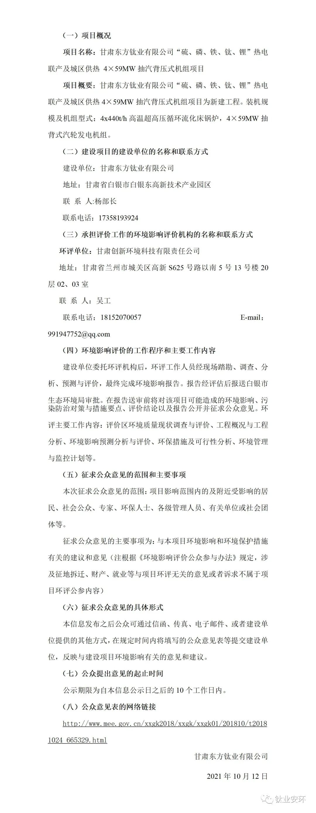甘肃东方钛业有限公司“硫、磷、铁、钛、锂”热电联产及城区供热 4*59MW抽汽背压式机组项目环境影响评价邀请公众参与第一次公示