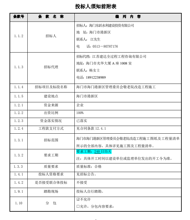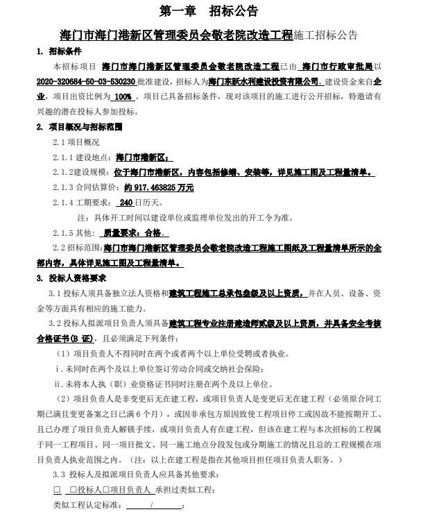 6招标范围:海门市海门港新区管理委员会敬老院改造工程施工图纸及工程量清单所示的全部内容,具体详见施工图及工程量清单。