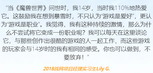 图中为2018年间,一位战网项目经理实习生的实习感言。俗话说:爱一行干一行,干一行爱一行。热爱自己的工作便是成功的第一步。