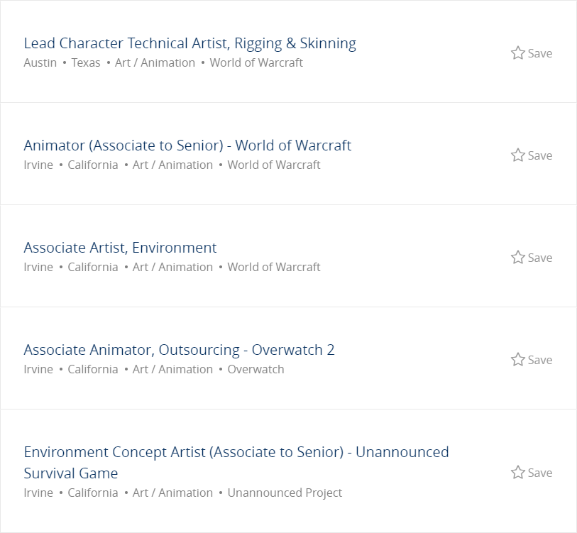 第一位同学提到了专业和岗位的问题,就岗位来说,其实游戏公司里包含的岗位类型、所涉及的专业领域,远比大家想象中的多。以暴雪公司举例,下图中便是暴雪目前提供的部分岗位。