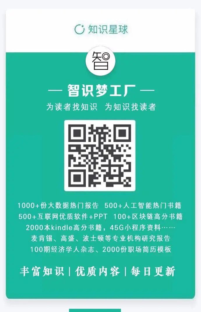 1000+份大数据热门报告 500+人工智能热门书籍 500+互联网优质软件+PPT 100+豆瓣高分书籍 2000本kindle高分书籍,45G小程序资料…… 麦肯锡、高盛、波士顿等机构研究报告 经济学人杂志、职场简历模板 为读者找知识,为知识找读者 原价50,优惠后只要20
