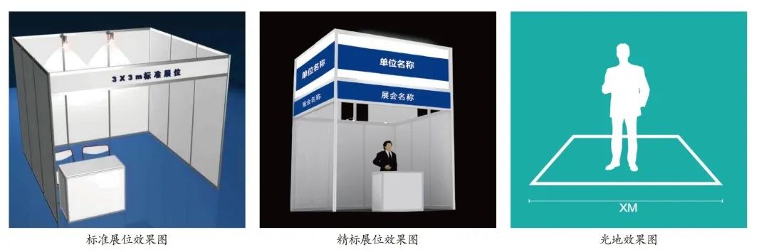 2. 精标展位基本配置:3m×3m展位(包括精装标准展台、布幅广告门楣、地毯、一桌两椅、门楣射灯、展位射灯、220V电源插座);