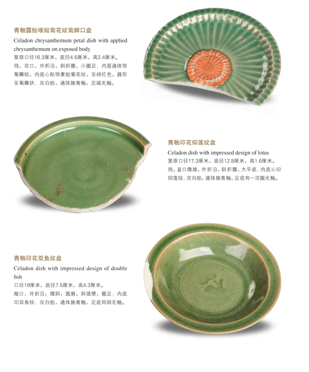 樊村泾元代遗址出土150余吨龙泉青瓷器,时代集中于元代中晚期,主要器形有碗、盘、盏、杯、洗、高足杯、炉、瓶、荷叶罐等数十类,装饰技法上有刻花、印花、贴花、点彩等,纹饰题材丰富,有云龙纹、飞凤纹、花卉纹、杂宝纹等,另有大量汉文和八思巴文款铭。