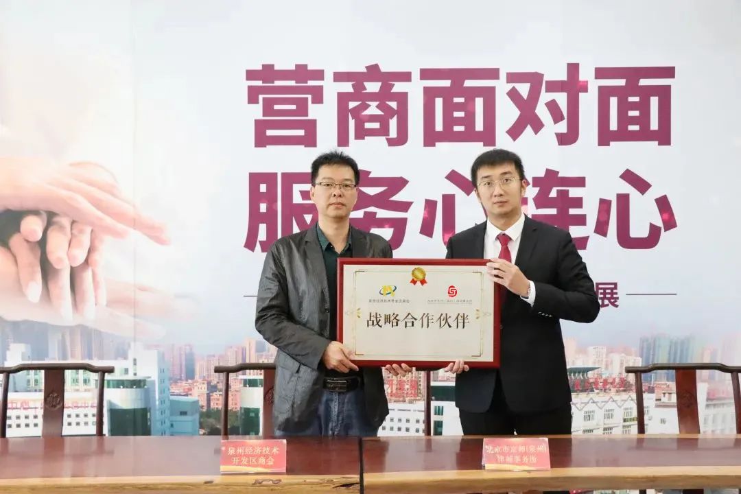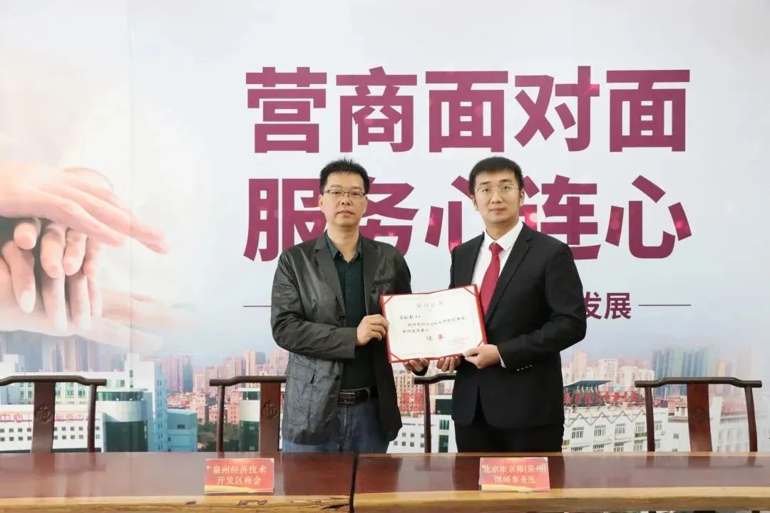 致辞后,京师泉州律所公共案源中心主任蔡弘毅与泉州经济技术开发区商会专职副会长潘双良各代表双方进行战略服务签约和授牌仪式,并在现场进行理事聘任仪式。