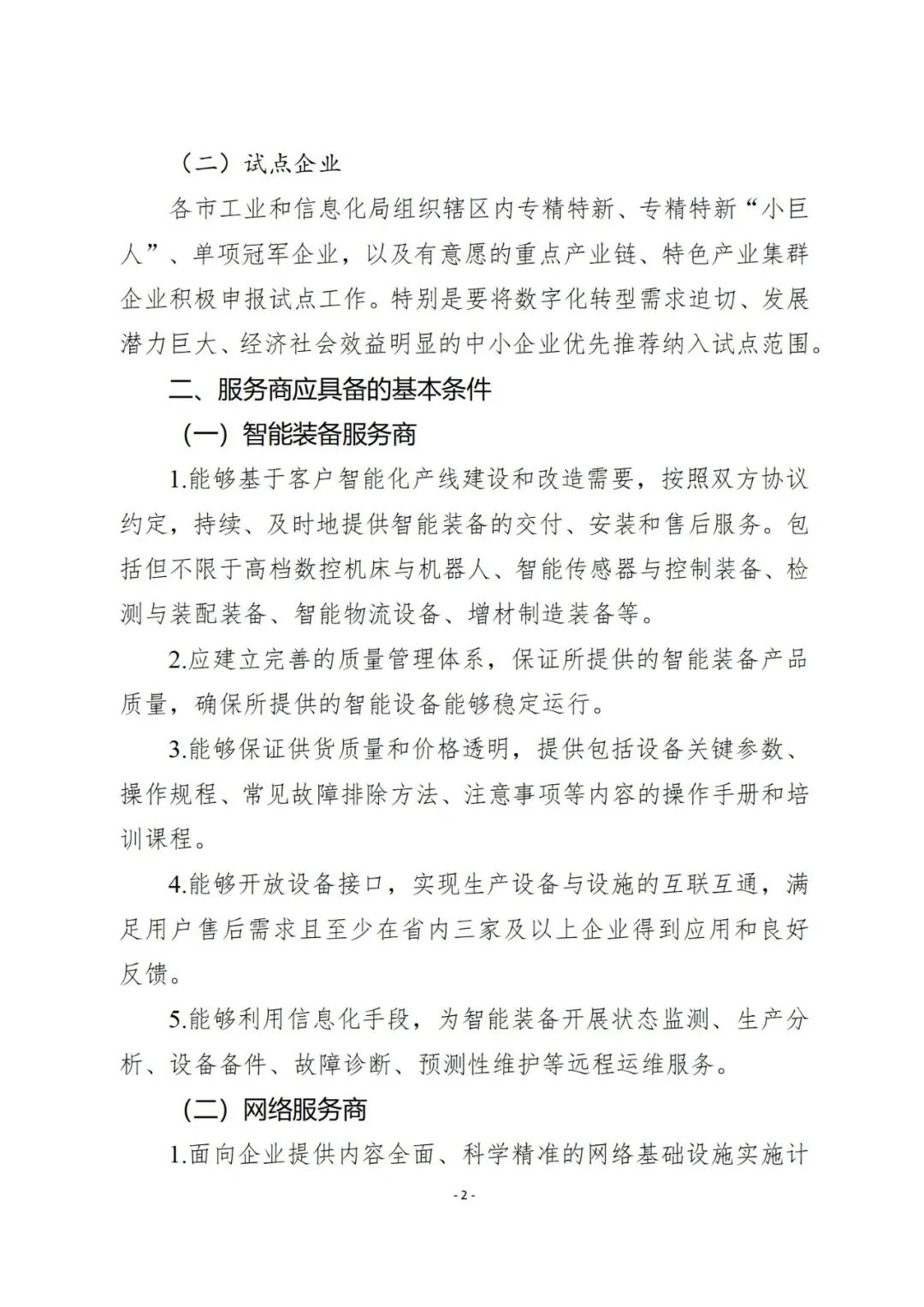 为深入贯彻国家关于加快中小企业数字化转型的决策部署,全面推动我省中小企业数字化转型发展,现就组织开展中小企业数字化转型试点工作通知如下:(一)面向全省开展中小企业数字化转型试点示范。以制造业关键领域和产业链关键环节的中小企业为重点方向,在全省范围内推荐遴选一批数字化转型需求迫切、发展潜力巨大、经济社会效益明显的中小企业开展试点示范。2023年,重点推动100家专精特新“小巨人”、国家级制造业单项冠军、“挂帅出征”百强榜企业,以及有强烈意愿的重点产业链、特色产业集群等率先开展数字化转型试点,培树一批数字化转型示范标杆。(二)面向全国征集中小企业数字化转型服务商。以中小企业数字化转型需求为导向,在全国范围内征集严选一批具备核心服务能力、成熟解决方案、相关行业成功案例且能够持续稳定提供高质量服务的优质数字化转型服务商,为我省中小企业提供专业、精准、高效数字化服务。2023年,重点打造100个以上数字化转型精品解决方案和产品,选树一批数字化转型“十佳”服务商。1.建立企业“需求池”。坚持以企业提质降本增效为目标,聚焦标志性产业链重点细分行业、中小企业特色产业集群和数字化转型试点城市,选择处于产业链关键环节和试点行业的优质企业建立数字化转型重点“需求池”,梳理形成中小企业数字化转型“需求清单”。各市要立足发展实际,推荐符合条件的企业积极争创数字化转型试点示范,推动数字化转型普及推广。2.建立服务商“资源池”。结合行业数字化转型共性特征和企业个性需求,面向全国择优遴选一批数字化转型服务商,打造具备较强技术支撑能力、较深行业知识积累、较好工程实施能力的服务商“资源池”,梳理形成与企业需求适配的数字化转型解决方案和产品“供给清单”。为企业提供规划咨询、评测诊断、软件开发、人才培训等一揽子数字化服务,加快构建较为完善的数字化转型服务生态。3.开展数字化水平评测诊断试点。依托中小企业数字化转型公共服务平台开展数字化需求征集、数字化水平线上评测和线下诊断工作。由国家中小企业数字化转型促进中心组织中国工业互联网研究院、华为、电信运营商等组成数字化水平评测诊断专业队伍,对试点企业研、产、供、销、服等全环节进行诊断,对企业数字化能力水平及转型需求精准“把脉问诊”,并自动匹配与需求精确适配的解决方案和产品,帮助和引导企业明晰转型思路、优化转型实践、提升转型效能。4.组织供需精准对接。依托中小企业数字化转型公共服务平台,为企业提供信息化基础软件、通用软件、专业软件,以及各类个性化定制等解决方案和产品服务;通过数字化水平评测诊断,构建企业转型需求图谱,汇聚数据挖掘、数据治理和数据可视化等专业工具,推动技术产品匹配度分析、企业需求智能对接等服务,实现供需有效撮合。5.扩大试点应用推广。通过示范带动、看样学样,梳理一批数字化转型细分行业,打造一批数字化转型标杆企业,培育一批优质数字化服务商,形成一批优秀数字化解决方案和产品,总结一批可复制、可推广的数字化转型典型经验和有效模式,引导和推动广大中小企业加快数字化转型。6.培训专业化人才。依托华为(山东)ICT学院、山东信息职业技术学院科学设置培训课程、开发教学内容、聘请专业讲师,面向制造业龙头企业、工业互联网平台企业、电信运营商等征集一批既懂IT又懂OT的工程技术人员,开展数字化水平评测诊断咨询师专题培训,培育一支高水平数字化咨询服务人才队伍。1.全方位支持企业开展数字化转型。鼓励企业开展数字化咨询服务确定转型思路,开展数字化转型服务商分级分类确定供给,遴选优质企业开展数字化水平评测诊断确定需求、搭建公共服务平台促进供需精准有效对接,打造一批试点示范标杆,形成一批典型应用场景。2.加快建设国家级中小企业数字化转型促进中心。整合科研院所、数字化转型服务商、优质企业等资源要素,加大数字化服务研发投入,加快探索公益服务和市场化运作相结合的运营模式,加速构建中小企业数字化转型服务生态体系,推动制造资源、创新要素、公共服务等资源协同联动。3.加大智能化技改支持力度。对入选试点企业实施的数字化、智能化、绿色化改造项目,将通过设备奖补、技改专项贷贴息、股权投资等方式给予优先支持。推荐符合条件的项目积极申报国家专项,获得更高层面、更大力度资金支持。4.优化省级“创新服务券”实施细则。按照“政府补一点,服务商让一点,企业出一点”的思路,重点支持中小企业开展数字化水平评测诊断、管理咨询、项目实施,网络和标识解析接入,以及企业上云用数、设备数字化改造、数据集成应用等服务。5.加速培养评测诊断咨询师队伍。对通过考核的人员,由中国工业互联网研究院、华为云计算、国家中小企业数字化转型促进中心共同颁发资格认定证书,设置高级咨询师、中级咨询师和咨询师三个等级,面向全国中小企业提供数字化水平评测诊断专业服务。6.加强金融支持。发挥省新旧动能转换基金作用,重点投向重大数字化转型项目。鼓励和引导金融机构面向中小企业数字化转型开发“专项贷”产品和服务。1.省外服务商在山东应有分支机构或常驻服务团队,开展