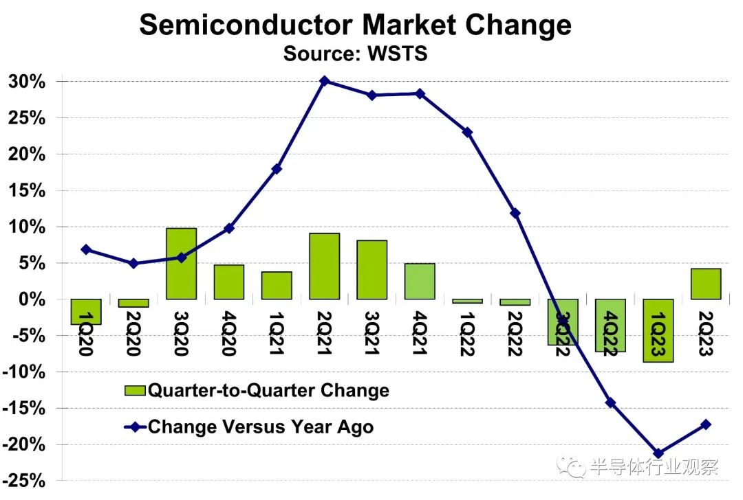根据WSTS的数据,全球半导体市场在2023年第二季度比2023年第一季度增长4.2%。2023年第二季度的增长是自一年半前的2021年第四季度以来的首次季度正增长。与去年同期相比,市场下降了17.3%,较2023年第一季度21.3%的同比下降有所改善。随着2020年疫情放缓的复苏,半导体市场的年增长率在2021年第二季度达到了30.1%的峰值。