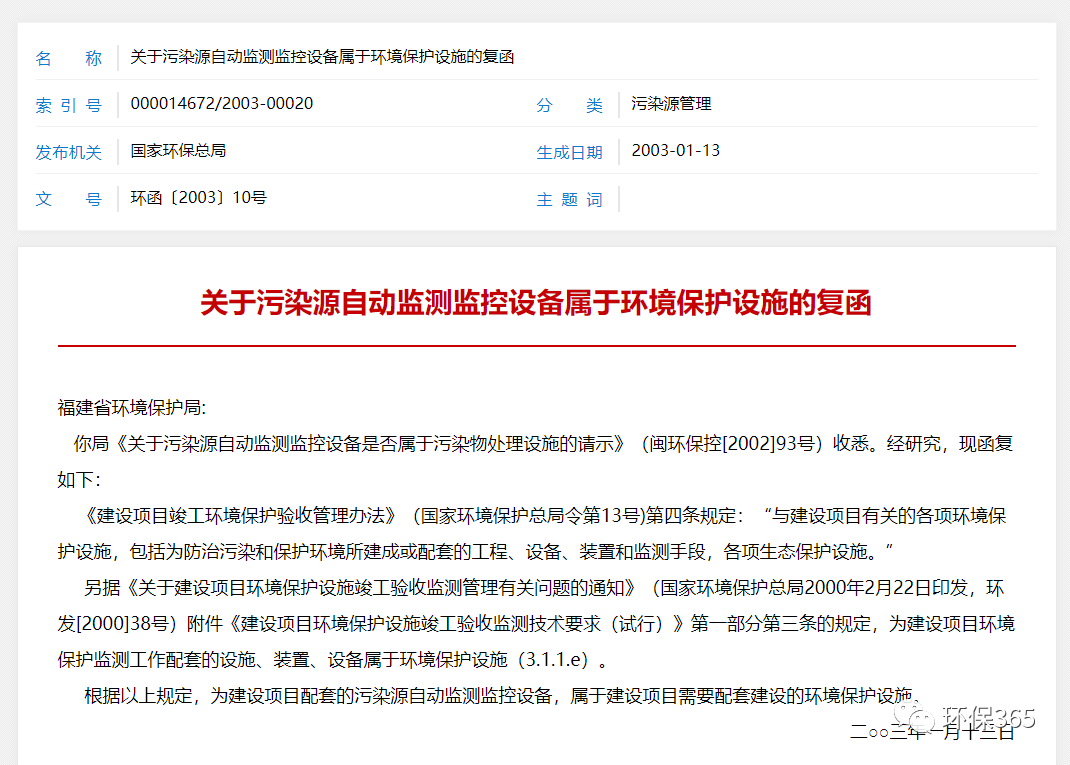 根据原国家环保总局发布的关于污染源自动监测监控设备属于环境保护设施的复函(环函〔2003〕10号),其中明确提到:为建设项目配套的污染源自动监测监控设备,属于建设项目需要配套建设的环境保护设施。