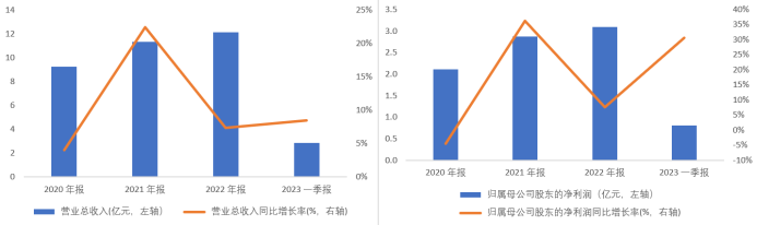 2020-2022年,公司营业总收入分别为9.24亿元/11.32亿元/12.15亿元,YOY依次为4.05%/22.43%/7.34%,三年CAGR为14.67%;归母净利润分别为2.11亿元/2.87亿元/3.09亿元,YOY依次为-4.49% /36.27%/7.59%,三年CAGR为21.01%。根据公司最新财报显示,在2023Q1,公司实现营业总收入2.87亿元,同比增长8.48%,归母净利润0.81亿元,同比增长30.52%。