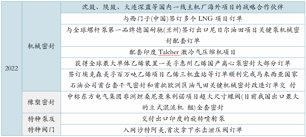 公司多领域客户资源丰富,核心客户重点项目稳步建设。公司主要客户为国有大型龙头企业及其下属骨干企业、大型知名民企及国际知名主机厂,如中石化、中石油、中海油、国家管网、国家能源集团、延长石油、中广核集团、中核集团、中国中铁集团、中国交通建设集团、荣盛集团、万华集团、恒逸集团、盛虹集团、沈鼓集团、陕鼓集团、北京航天石化技术装备工程公司、嘉利特荏原、大连深蓝、苏尔寿、利欧华能、西门子、埃利奥特等。此外,公司核电领域全面替代进口工作继续高速前进,2022 年营业收入突破 5000 万元,实现核主泵静压轴封的实际应用,成功打破国外厂家垄断。