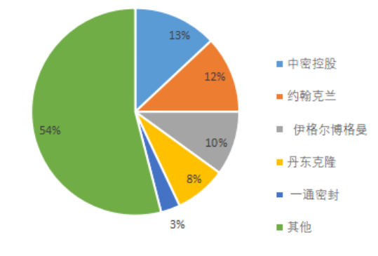 机械密封全球市场是一个较为集中的市场,竞争格局相对稳定。约翰克兰、伊格尔博格曼、福斯三大国际巨头几乎占据全球市场 70%以上市场份额。国内密封件市场竞争格局分散,CR5 达 46.1%。根据观研天下数据,2020 年国内密封件市场主要被国内国际龙头占据,公司是国内市占最高的企业,市占率为13%。其他市占率较高的公司分别为约翰克兰、伊格尔博格曼、丹东克隆及一通密封,2020 年市占率分别达到 12%、10%、8%及 3%,2020 年国内密封行业 CR5 达到 46.1%。