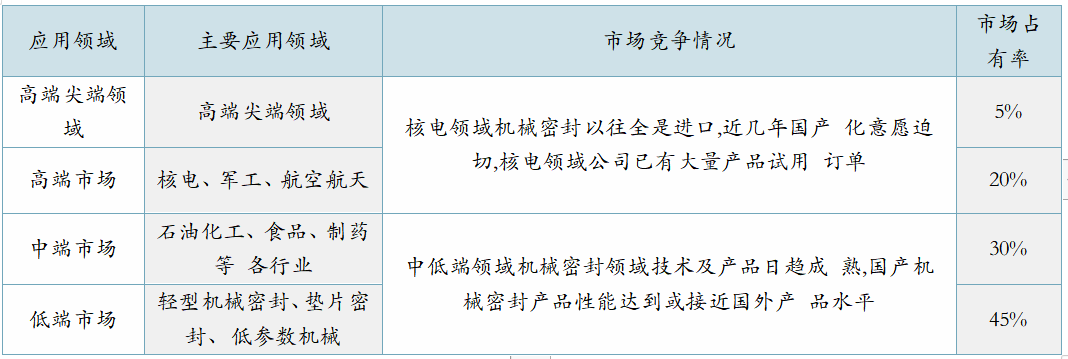 机械密封市场分层特点明显,高端市场以核电、军工、航空航天领域应用为主,整体市占达约 25%;中端市场普遍分散于各行各业,以石油化工、食品、制造等行业为主,整体市占率达到约 30%;低端市场则主要以轻型机械密封、垫片密封及低参数机械密封为主,市场占有率约 45%。目前我国中低端领域机械密封技术及产品日趋成熟,国产机械密封产品性能已能够达到或接近国外产品水平。高端的核电领域机械密封以往全是进口产品,近几年下游主要客户国产化意愿强烈,国产化替代势在必行。