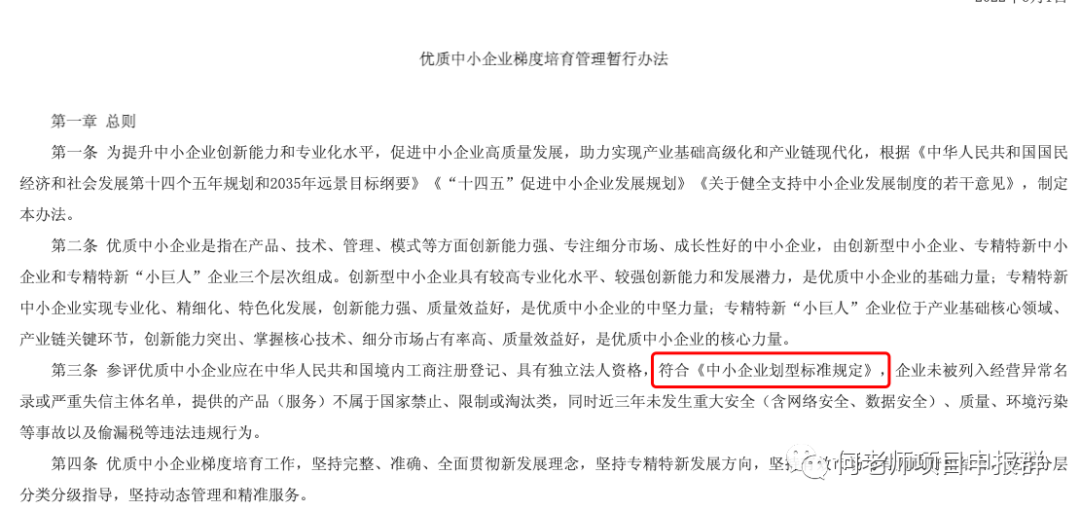 《优质中小企业梯度培育管理暂行办法》第三条,对于申报企业,非常明确的要求符合《中小企业划型标准规定》。