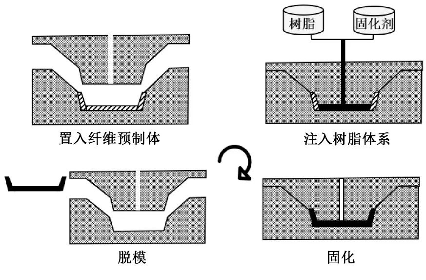 传统RTM工艺过程如下图所示。模具中空气的存在会使成品有很大缺陷,为了能够从模具内部输出空气,RTM模具必须至少具有一个用于注入树脂的入口和一个出口,有时也有多个输入和输出。根据固化剂和树脂在注射前混合还是注射后混合,将此成型工艺分别分为单组分注射和双组分注射,其中双组分注射是在注入模腔前在混合器中按特定的比例混合。