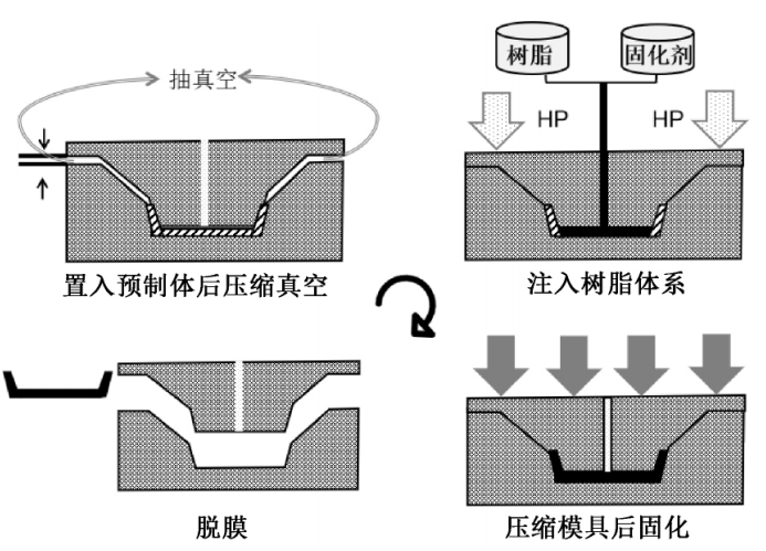 HP-RTM成型工艺是RTM的衍生发展工艺,主要分为高压注射成型工艺(HP-IRTM)和高压压缩成型工艺(HP-CRTM)。这类工艺总体都是借助高压制造出低孔隙率和高纤维体积分数的制品。此类工艺对模具硬度等要求较高,否则容易变形,从而引起干纤维、纤维析出等问题。