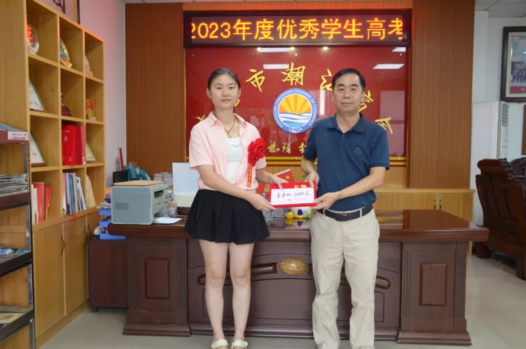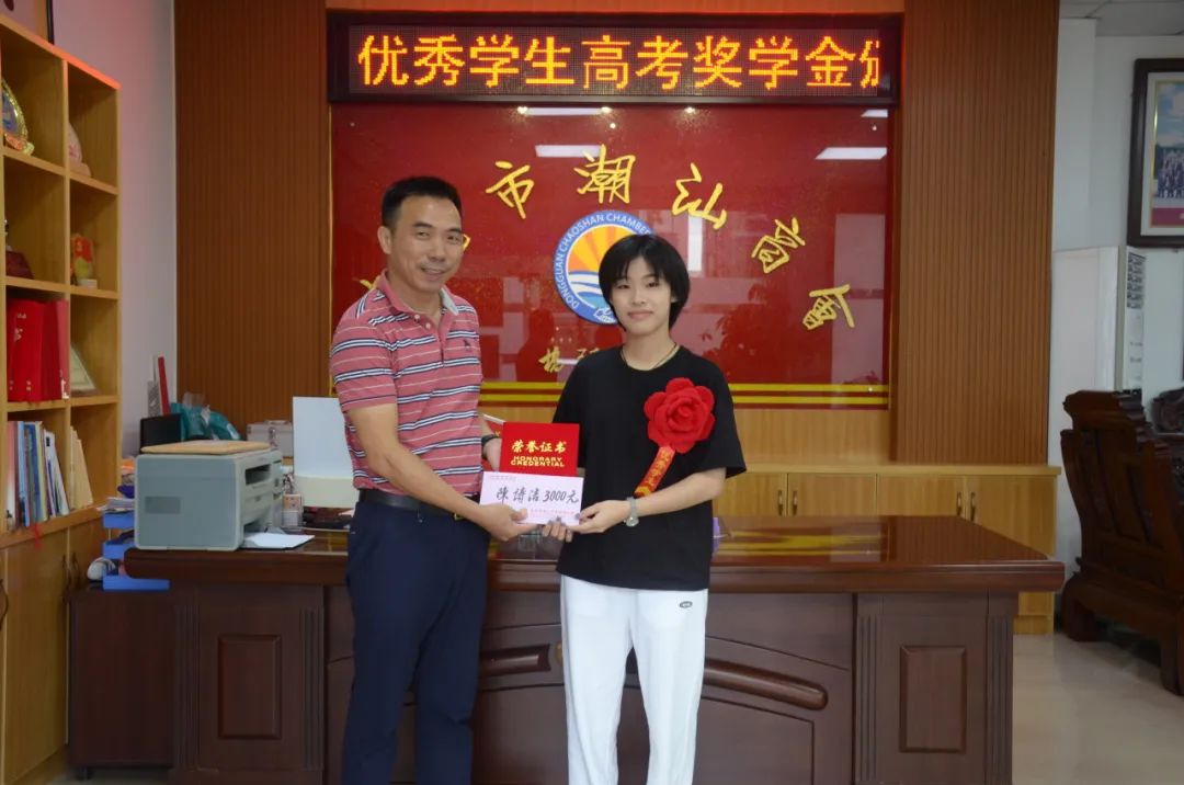 荣获高考奖学金学生代表陈诗洁同学发言,她说:我能站在这里作为学生代表在此发言,不仅要感谢我父母对我的用心栽培,更要感谢商会长辈对我寄予的期望与信任。对于即将迈上人生新阶段的我们来说,这是份沉淀的礼物,“心存感恩,励精图治”是我作为学生代表最想说的话。我们身后不仅有朋友亲人还有商会前辈们,一旦想到他们的帮助与支持,就会感到身心再次充满力量,朝着前路栉风沐雨地前行。作为潮汕青年,未来的每一天都是珍贵的,人生有涯而恩情无边,衷心地感谢商会的长辈们对我们学业的支持,须知少时凌云志,曾许人间第一流。我会加倍努力,不虚度光阴,用大学四年的时光去改变自已的人生轨迹。