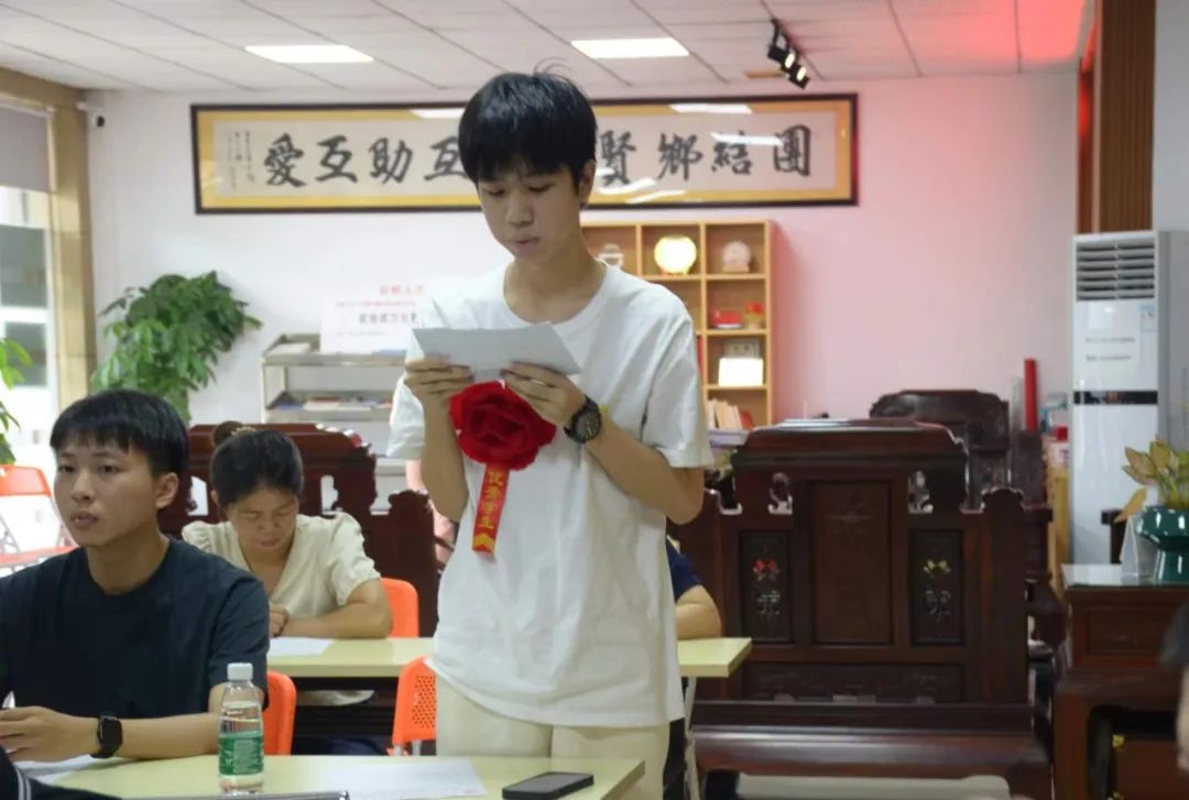 荣获考研奖学金优秀学生代表徐凯浚同学讲话:“首先感谢商会领导的关心和鼓励。也很荣幸作为学生代表在这里发言。我2019年入读广东外语外贸大学,今年录取为广东财经大学的应用统计硕士研究生。在过去的一年里,我经历了各种各样的磨练,比起这份录取通知书,更多是收获了很多书上无法学到的知识,得到了一段毕生难忘的经历。录取通知书是我这一个阶段的结果,同时也是下一个阶段的开始,求学之路仍在一直走下去。收到这份录取通知书,并不是我一个人孤军奋战的结果,要感谢所有为我提供过支持、帮助的人。感谢每天晚上和我一起讨论题目的研友,感谢我的父母,还要感谢我的老师们、同学们、以及在座的商会领导。最后,希望我能够保持初心,学无止境,积极向上,学有所成,将来为国家和家乡建设多做贡献。