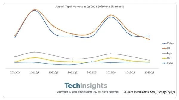 此外,中国在二季度首次超过美国,成为iPhone出货量最大的单一市场。而苹果加大了印度地区的制造规模后,iPhone二季度在印度的出货量也同比增长超过50%。
