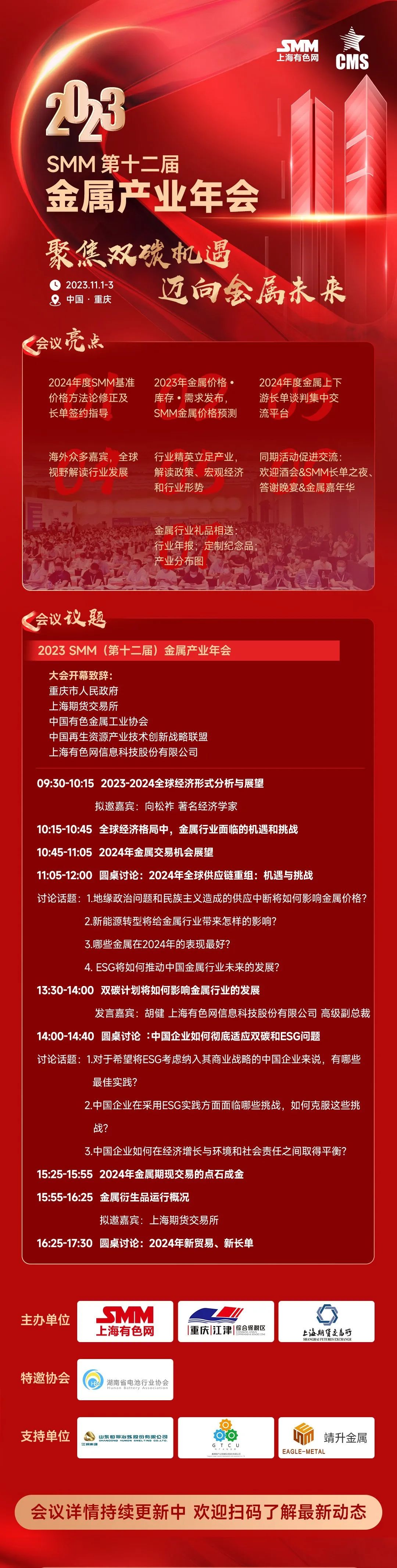 2023 SMM金属产业年会,将于11月1-3日,在重庆召开,会议聚焦金属价格行情、市场趋势、贸易形势、行业政策和低碳技术等热点话题,邀请到行业专家、学者、企业大咖、宏观经济学家和资深分析员等专家做主题演讲。除会议论坛外,还特设企业供需洽谈、长单之夜、 金属嘉年华等环节。欢迎大家报名参与2023金属产业年会