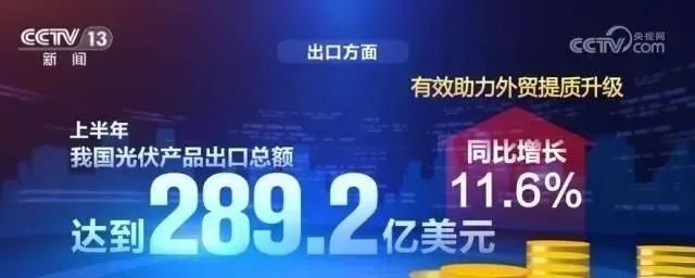 出口方面,上半年,我国光伏产品出口总额达到289.2亿美元,同比增长11.6%,有效助力外贸提质升级。