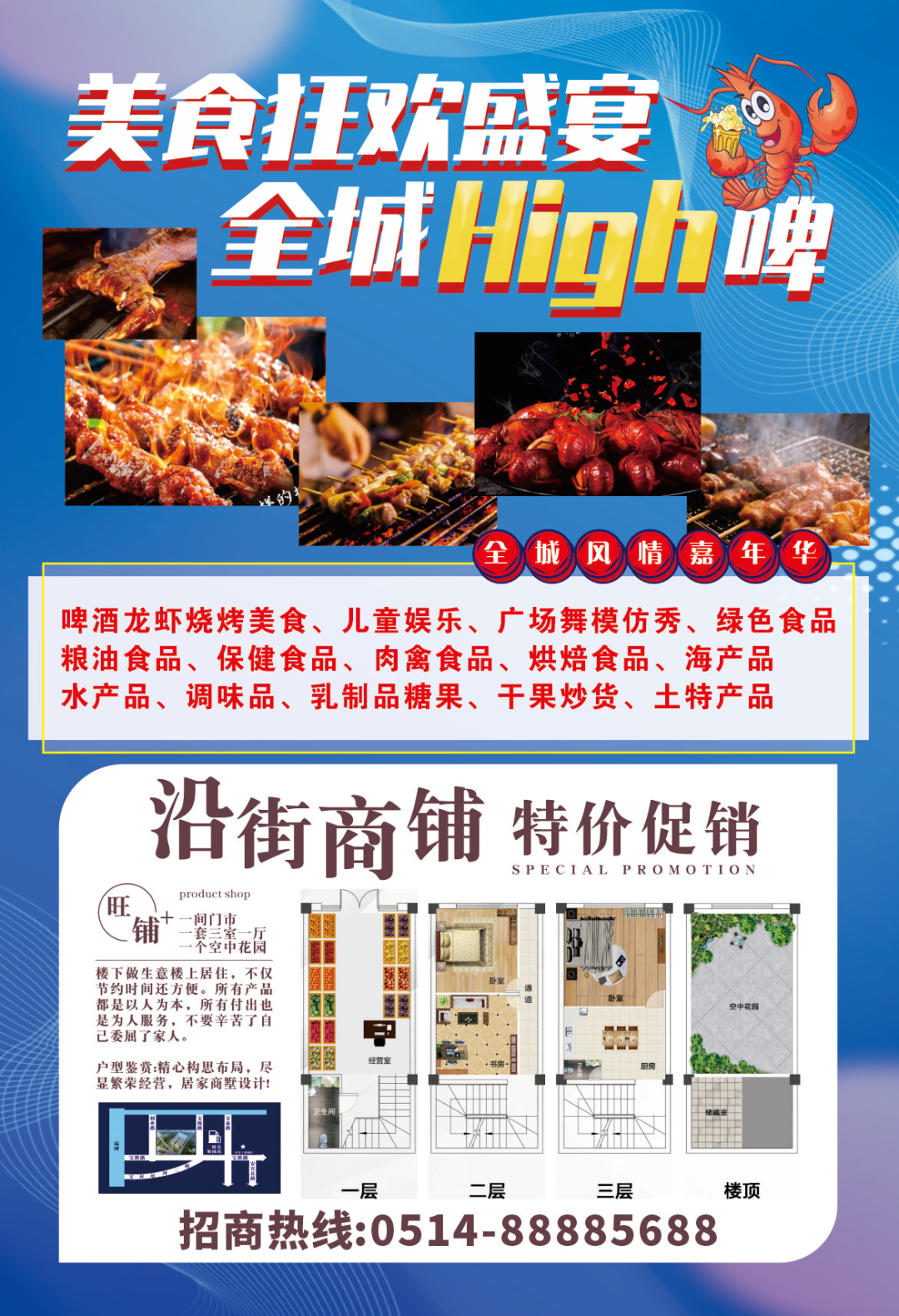 龙虾啤酒节专区,西瓜节专区、特色小吃专区;