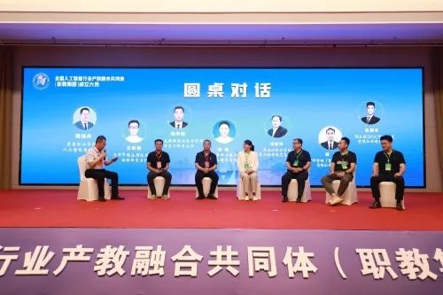 在圆桌对话环节,天津中德应用技术大学物联网系主任王新强、石家庄铁路职业技术学院信息工程系主任张庆彬,江苏海事职业技术学院信息工程学院院长张娟,黑龙江职业学院信息工程学院党总支书记金忠伟,中科智健(重庆)数据科技有限公司副总经理唐伟,随机数(浙江)智能科技有限公司教研总监赵瑞丰共同分享了人工智能行业高素质人才培养的经验与做法。