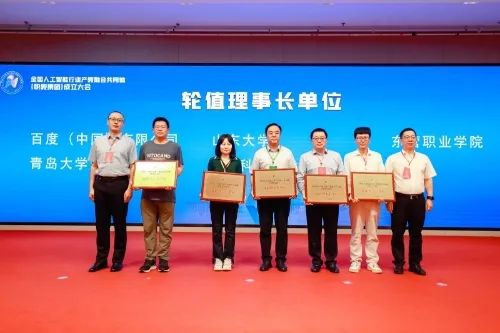 在成立仪式上,8位嘉宾共同启动全国人工智能行业产教融合共同体(职教集团),共同体(职教集团)首批成员单位有142家,覆盖25个省、市、自治区;会上,百度(中国)有限公司、山东大学、东营职业学院、广东科学技术职业学院、青岛大学未来研究院当选首届理事会轮值理事长单位,在授牌仪式上为5家轮值理事长单位、10家常务副理事长单位代表、10家副理事长单位代表进行了授牌;在公益项目发布环节,推出“人形机器人百校公益计划”,为共同体成员单位免费提供100名人形机器人免费使用1年,共同探索人工智能机器人领域发展。