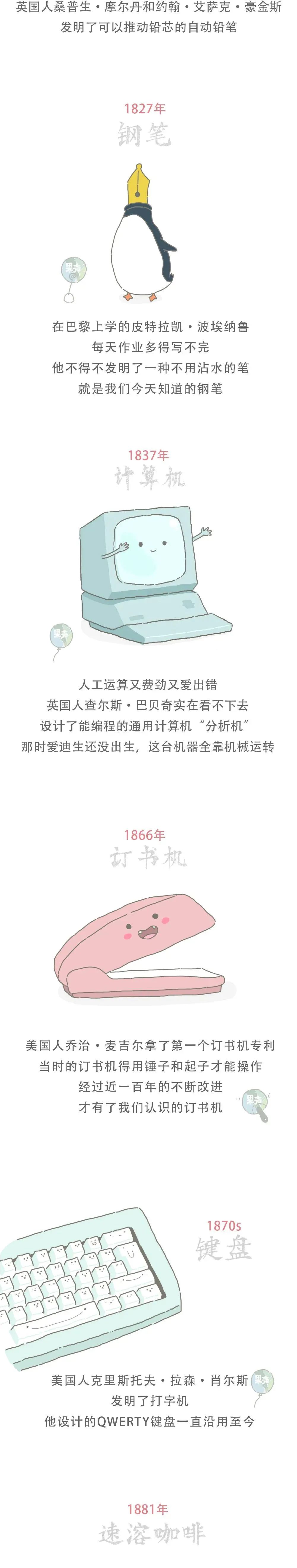 一件东西的发明,往往不是一个人的功劳,而经典的工具,更是许多人不断努力改良而来。其中有一些物品的发明人尚存在争议,比如便利贴和U盘;另一些物品的发明经历了漫长的过程,比如计算机和订书机。本文中选取的发明时间和发明人,依照了公认的主流说法,选取了较为标志性的人物和时间节点。