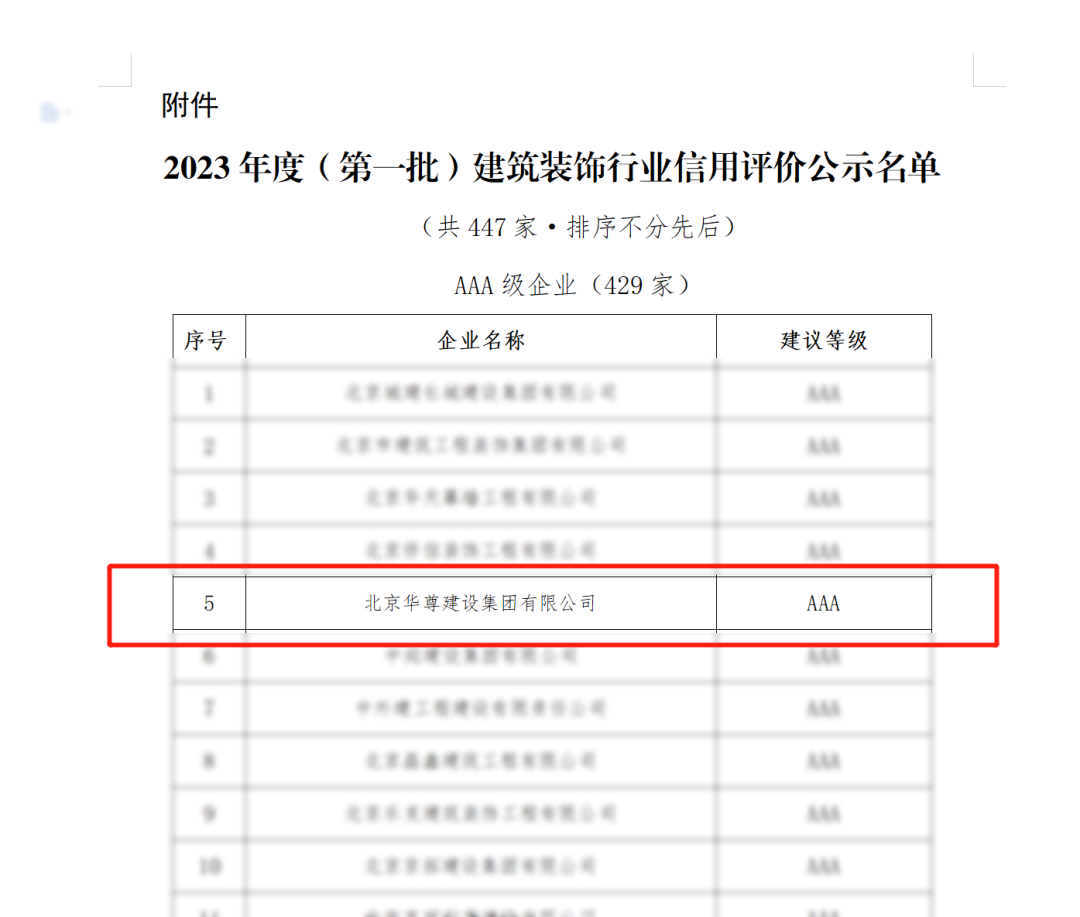 至此,华尊建设集团已连续十余年荣获“建筑装饰行业AAA级信用企业”称号,企业信用和品牌建设工作备受行业权威肯定。