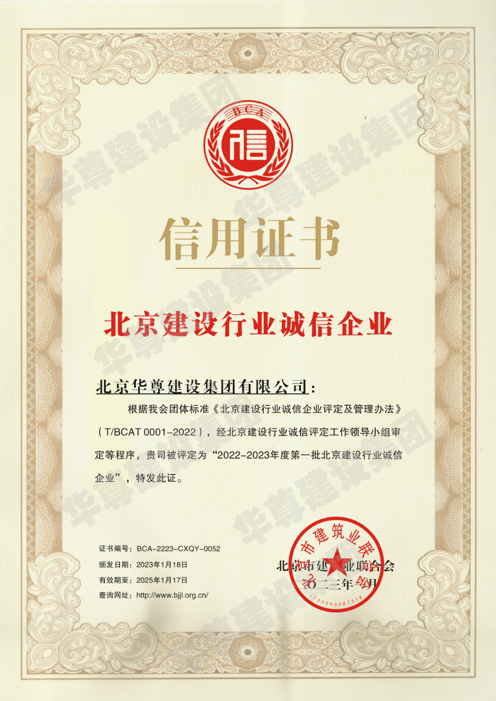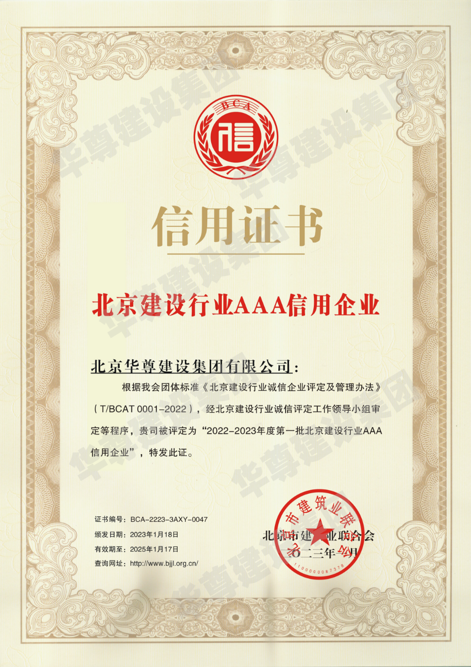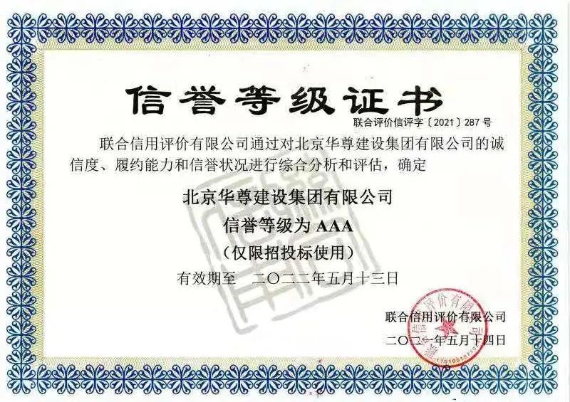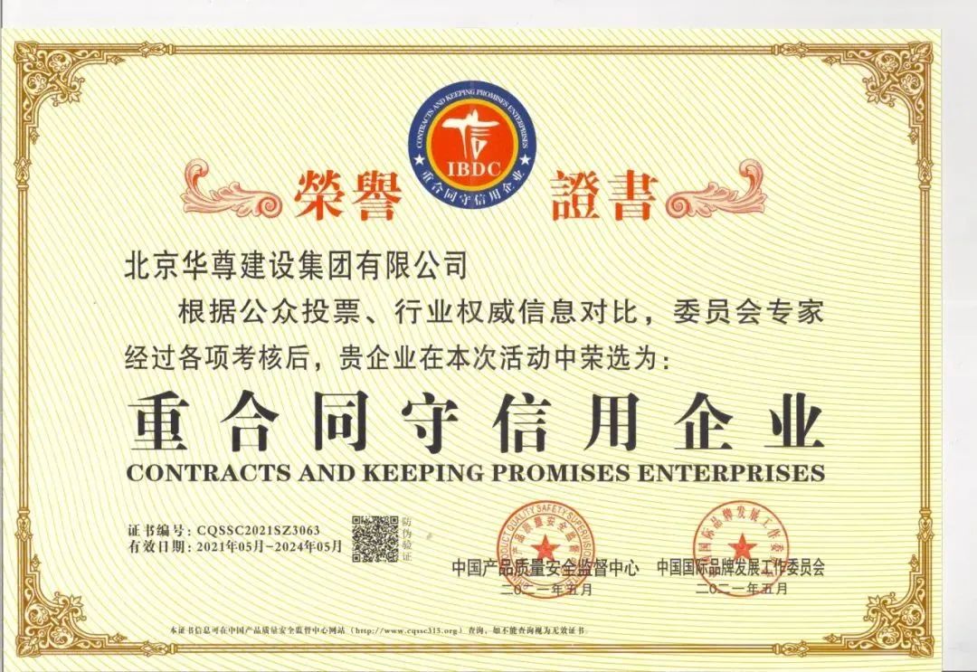 35年间,华尊建设集团珍视每一位客户给予的信任,精心雕琢每一个项目,除本次获奖外,还曾获”北京市建设行业诚信企业“、“北京建设行业AAA信用企业”、“联合信用评价AAA”、“重合同守信用企业”等荣誉奖项,华尊建设集团始终守信用、强实力、重交付!