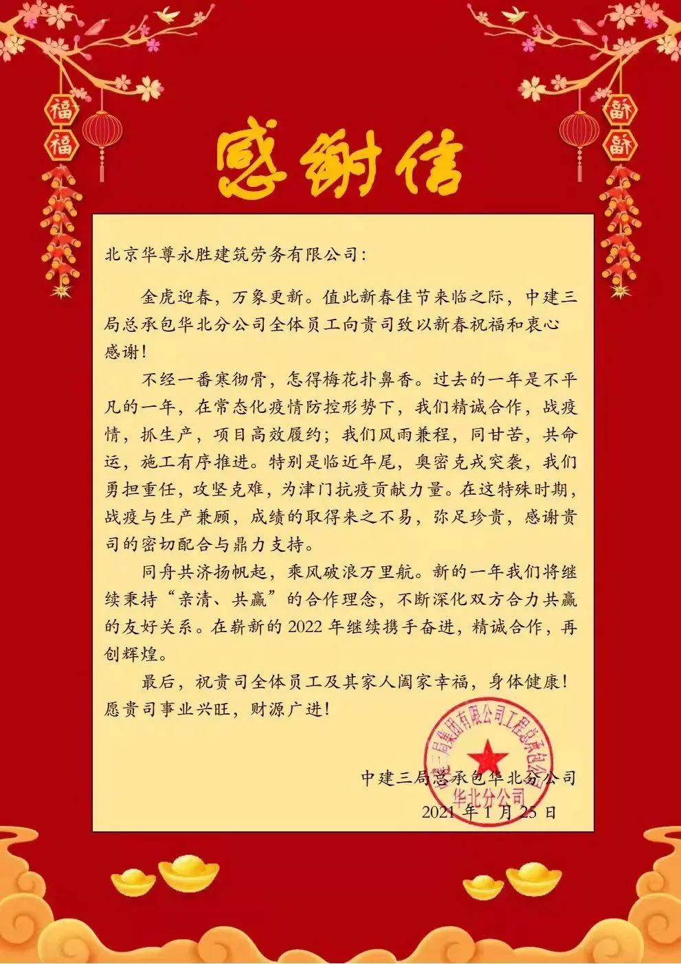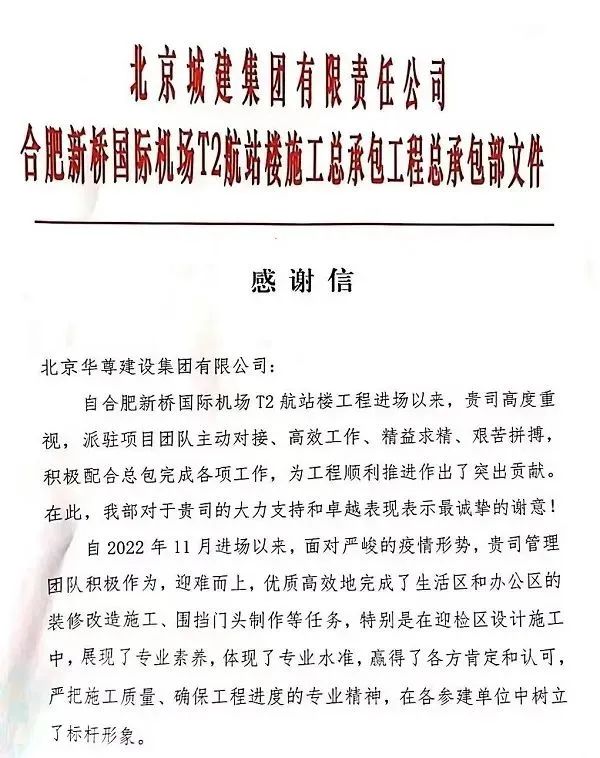 除获评权威官方的信用评定外,华尊建设集团凭借积极专业的工程能力也获得了甲方单位的感谢信、锦旗等,用品质荣获多方赞誉。