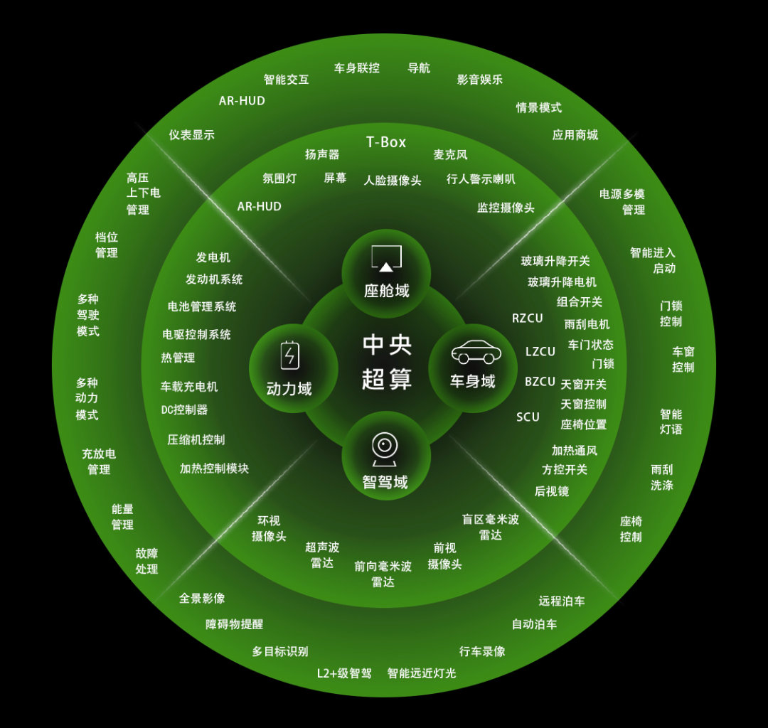 四域合一,是指座舱域、智驾域、动力域、车身域融合为一,由一个中央超算盒子处理与控制。盒子中的一块SOC芯片负责数据处理,控制智能驾舱和智能驾驶;另一块MCU芯片负责逻辑计算,控制整车和车身。