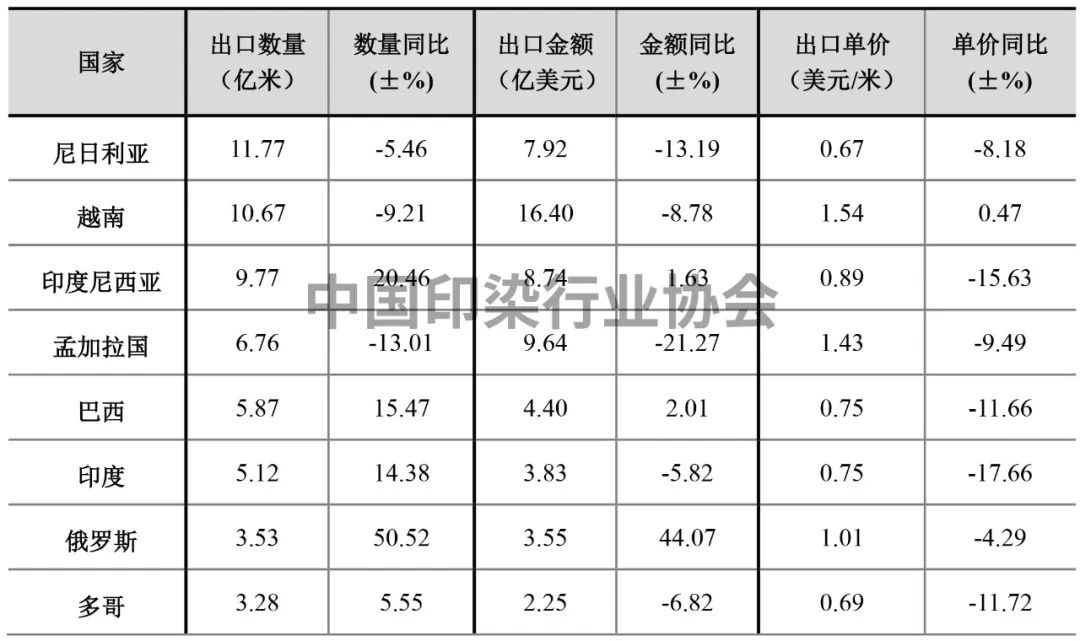 2023年上半年我国印染八大类产品出口部分国家情况