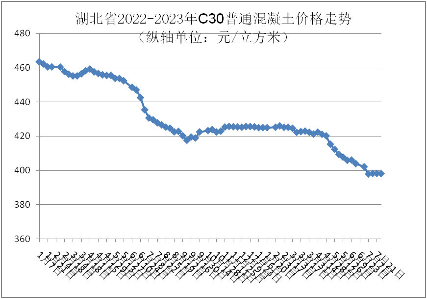 7月份,强度等级C30普通混凝土全省均价为398.11元/立方米,环比下跌1.58%,