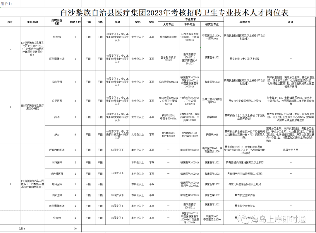 本次计划考核招聘编制内卫生专业技术人才36名。(其中:白沙黎族自治县人民医院<白沙黎族自治县医疗集团总医院>12名,基层医疗机构<医疗集团各分院>24名)(见附件1)。