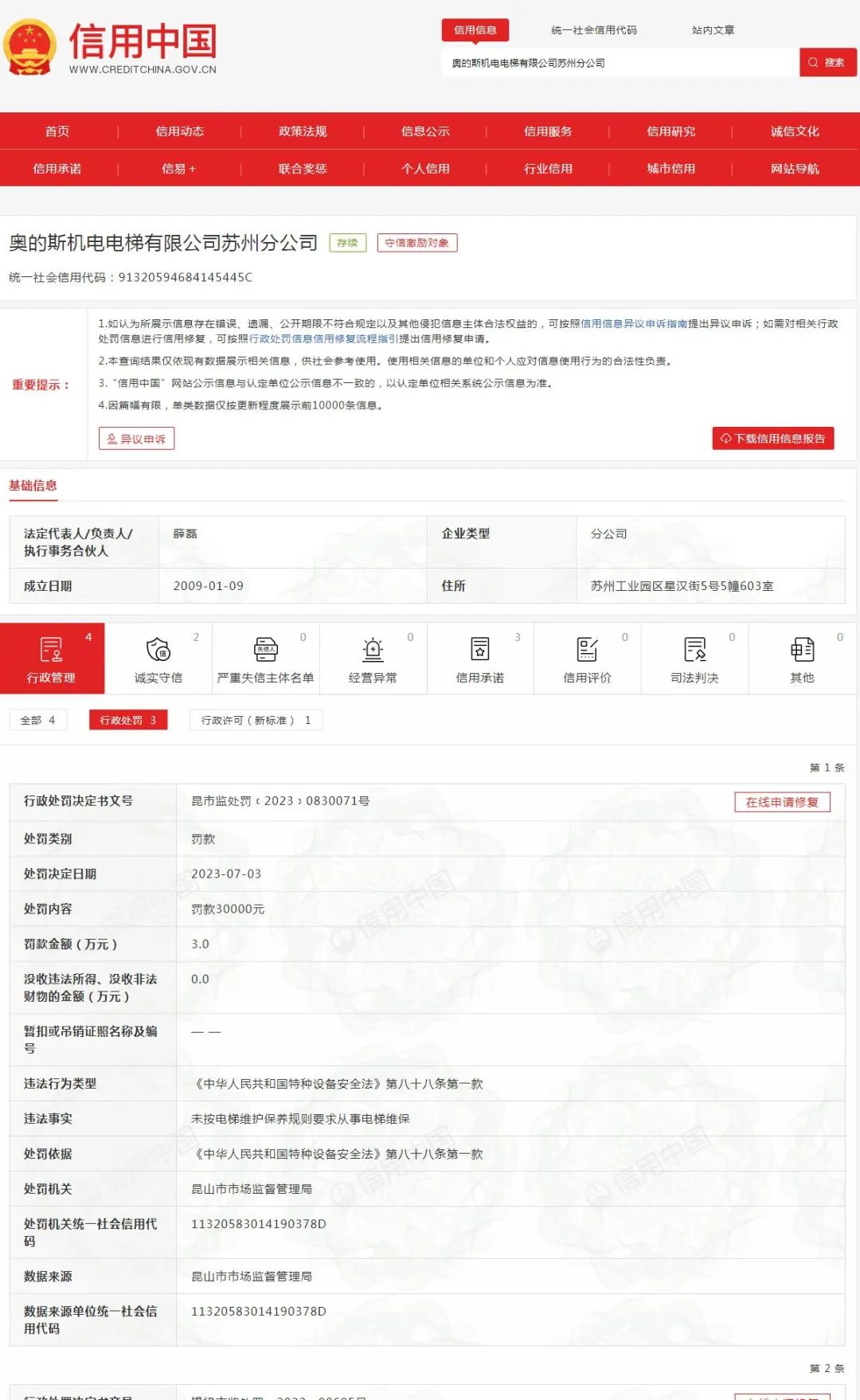 据信用中国查询,2023年7月3日,奥的斯机电电梯有限公司苏州分公司因未按电梯维护保养规则要求从事电梯维保被行政处罚,并被罚款3万元。