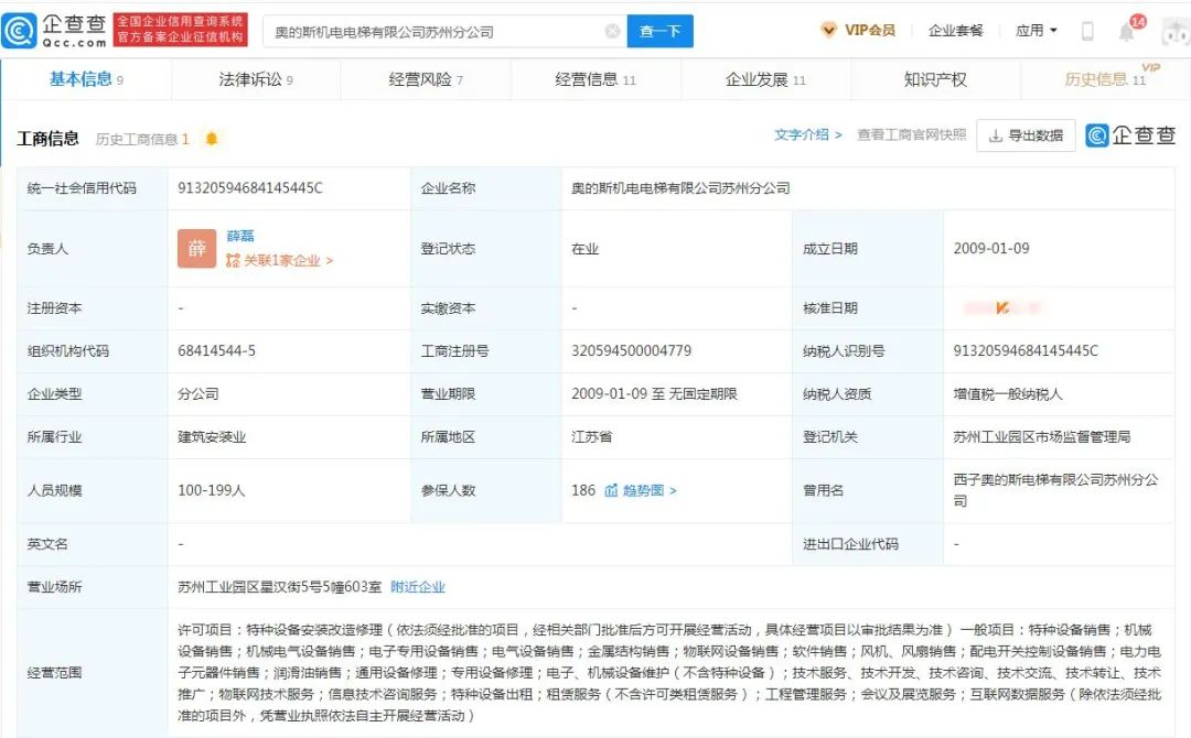 据企查查显示,奥的斯机电电梯有限公司苏州分公司成立于2009年1月9日,负责人为薛磊,统一社会信用代码:91320594684145445C。