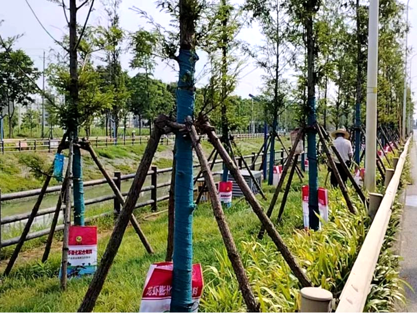 针对生长环境受限、储水能力差或需水量较大的植株,采用水袋滴灌的形式开展“点对点”精细化浇灌,缓慢地向大树根系土壤持续供水,达到深层补水的效果,同时让行道树在夏天“喝饱水”。