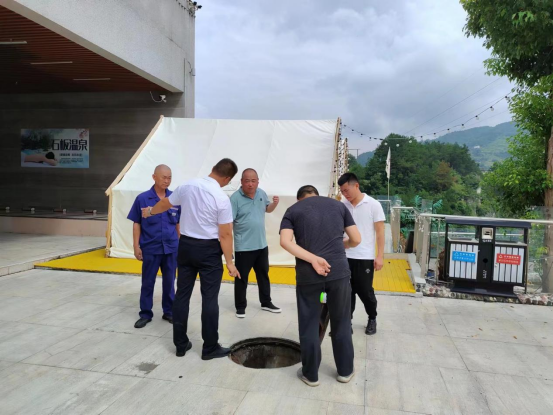 集团公司副总经理陈定文带领安全管理部、建瓴公司工作人员会同施工方处理悬崖温泉酒店污水排放事宜,并对酒店安全生产隐患进行排查。