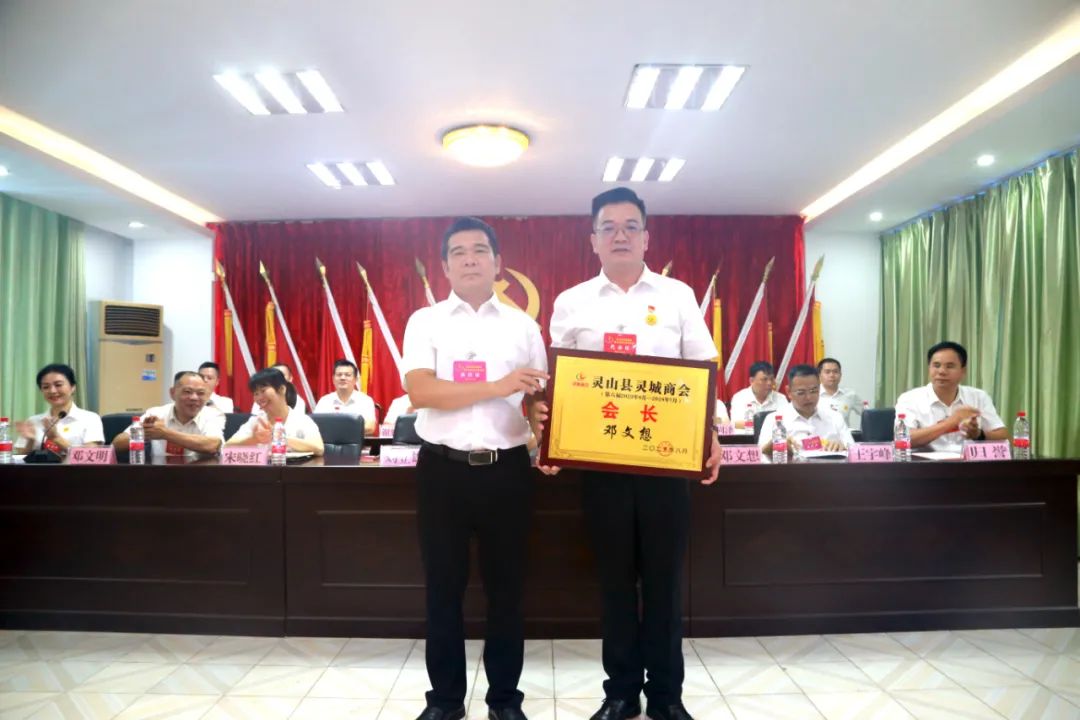 大会通过了《灵山县灵城商会章程(草案)》、《灵城商会第六次会员代表大会选举办法(草案)》,并依法选举产生了灵城商会新一届领导班子。随后,新老会长进行商会会旗交接仪式,并由新当选的灵城商会会长邓文想代表新一届商会领导班子发言。