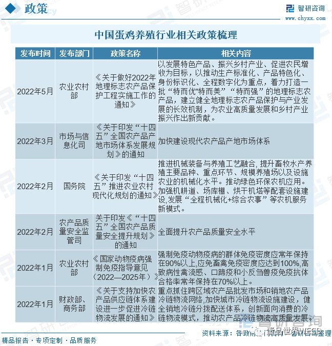 蛋鸡养殖所属畜牧业是国家重点扶持的国民经济基础产业,目前,国家对畜牧业发展采取的产业政策是加强农业的基础地位,提高居民畜禽产品消费水平,在财政、税收、融资等方面给予了扶持。企业在产品增值税、企业所得税和国家财政补贴、金融扶持等方面享受了优惠政策。近两年我国蛋鸡养殖行业相关政策如下: