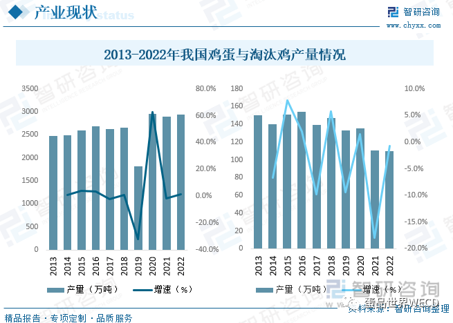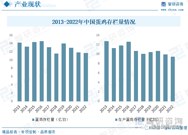 自1985年,我国鸡蛋年产量和蛋鸡存栏量稳居世界第一,人均占有鸡蛋量远超全球平均水平,与此同时,每年约有数十亿羽蛋鸡被淘汰,据统计,2022年我国蛋鸡存栏量为11.74亿羽,在产蛋鸡存栏为9.46亿羽,较2021年度9.97亿只同比下降0.51亿只,降幅为5.1%。