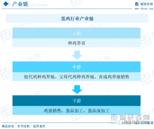 我国的蛋种鸡产业链始于曾祖代种鸡育种,祖代蛋种鸡、父母代蛋种鸡、商品代育成鸡、商品代蛋鸡以及鸡蛋等几个生产环节相互关联、相互影响。蛋鸡产业完整的产业链如下: