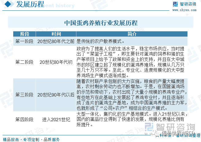 蛋鸡养殖产业是一个以纵向血缘关系为纽带的多元的代际畜禽产业,从原种鸡、曾祖代蛋种鸡、祖代蛋种鸡、父母代蛋种鸡、商品代蛋鸡到鸡蛋产品是一个完整、系统的代次繁育流程。蛋鸡品种按照蛋壳颜色分类的话,可以分为褐壳、粉壳、白壳、绿壳蛋鸡等品种。其中,目前褐壳蛋鸡和粉壳蛋鸡在我国养殖较多。多年来我国蛋鸡养殖和鲜蛋消费总量规模已处于世界第一,但整个行业仍处于“大而不强”的尴尬地位。小规模无序、非标准化的“农户散养”、“小规模家庭饲养”的养殖模式不仅制约着整个行业的现代化发展。我国的蛋鸡行业的发展已有四十余年,大致分为四个阶段: