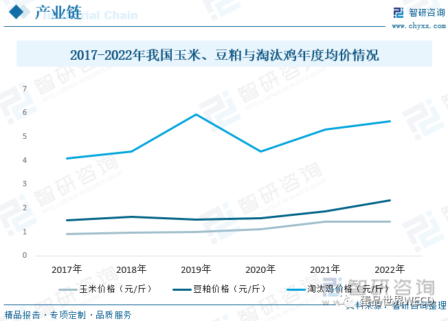 蛋鸡产业链主要有种鸡和商品蛋鸡2个环节,其中种鸡环节应加速内部整合,大型种鸡企业集团应与商品代客户构建稳定而牢固的战略合作关系,通过改善服务、保证质量、加强内部经营管理获得生存空间,从而熨平周期,降低市场风险。影响鲜蛋生产成本波动有三个关键变量,分别是玉米、豆粕和淘汰鸡价格。玉米和豆粕价格影响育成鸡身价和产蛋鸡饲料成本,育成鸡身价和淘汰鸡价格影响鲜蛋的种摊成本。据统计,2022年玉米与豆粕价格高位运行,淘汰鸡价格同比上涨,其中玉米均价1.44元/500g,与2021年度持平,豆粕均价2.32元/500g,同比增长24.7%,淘汰鸡均价为5.65元/500g,同比增长6.4%。