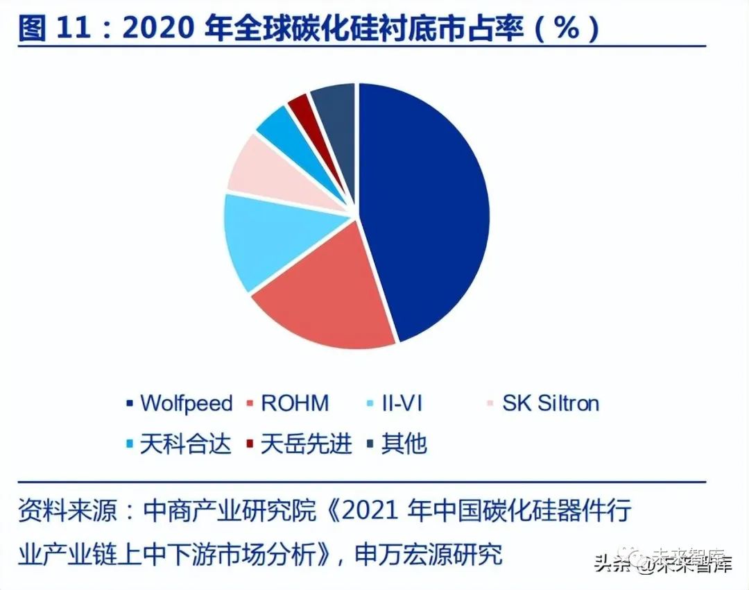 分导电型和半绝缘型市场看:1)2020 年全球导电型碳化硅衬底市场中,Wolfspeed 市占率达 62%,CR3 约 89%,国内份额最大的天科合达仅占 4%;2)2020 年全球半绝缘 型碳化硅衬底市场中,Wolfspeed、II-VI 分别占 33%、35%的市场份额,CR2 约 68%, 国内天岳先进占 30%。