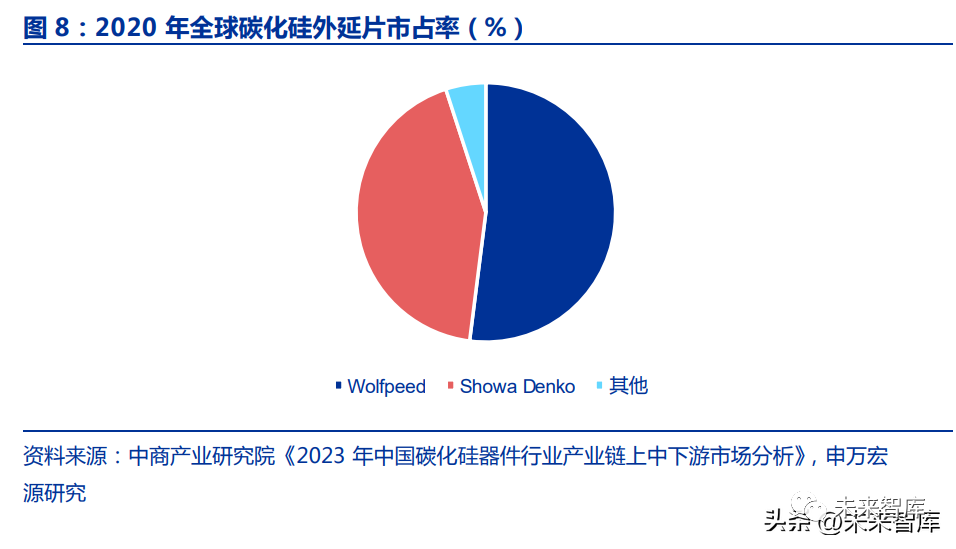 碳化硅外延市场由 Wolfspeed 和昭和电工(Showa Denko)双寡头垄断。根据 Yole 数据,2020 年全球碳化硅外延市场中,Wolfspeed 占 52%,昭和电工占 43%,CR2 共占 95%。